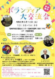 コロナ禍が明け、柏崎市内ではボランティア活動が再び活発になっています。これまで活動を続けてきた方や、新たに活動を始めた方の取組を披露する場を提供するとともに、「ボランティアの魅力」をテーマに語り合い、参加者同士が活動の意義や魅力を改めて確認することを目的として、ボランティア大交流会を開催します